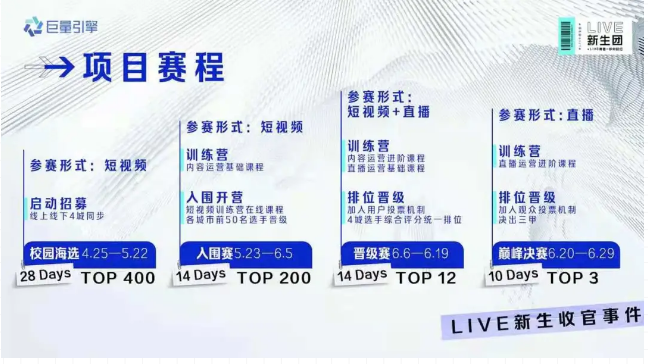 赛事采取线上报名的方式,全国在校大学生仅需拍摄制作一条参赛短视频,并加话题#LIVE新生团#后在抖音平台发布即视为成功报名。至此,一场属于大学生的精彩创意短视频PK即将上演!