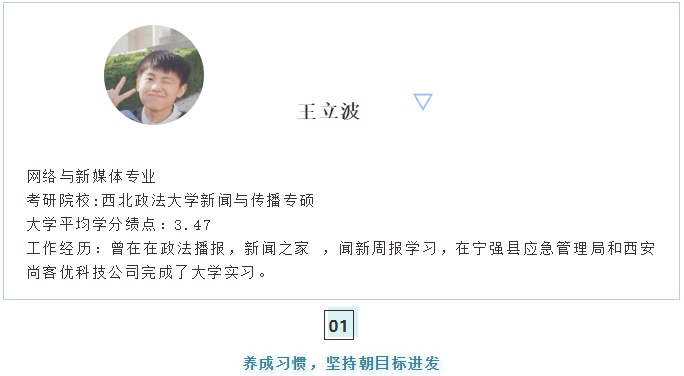 也是因为考研他养成了看书的习惯,以前他可能几个月才会去接触一点书籍,而现在基本上都是主动看书,每天至少会留出半小时来看书。“一本200页的书我可能得看两个月才能看完。一年也就6本书,阅读量虽然很小,但长期坚持下去一定会有收获!”王立波说到。在考研期间大家都有自己的目标,受目标驱使任何人都能坚持去追求目标,但是一旦失去了这种目标,很多人会陷入无事可干的境遇。路阻且长,行则将至。这种小的习惯,长久坚持下去才会让你长久受益。