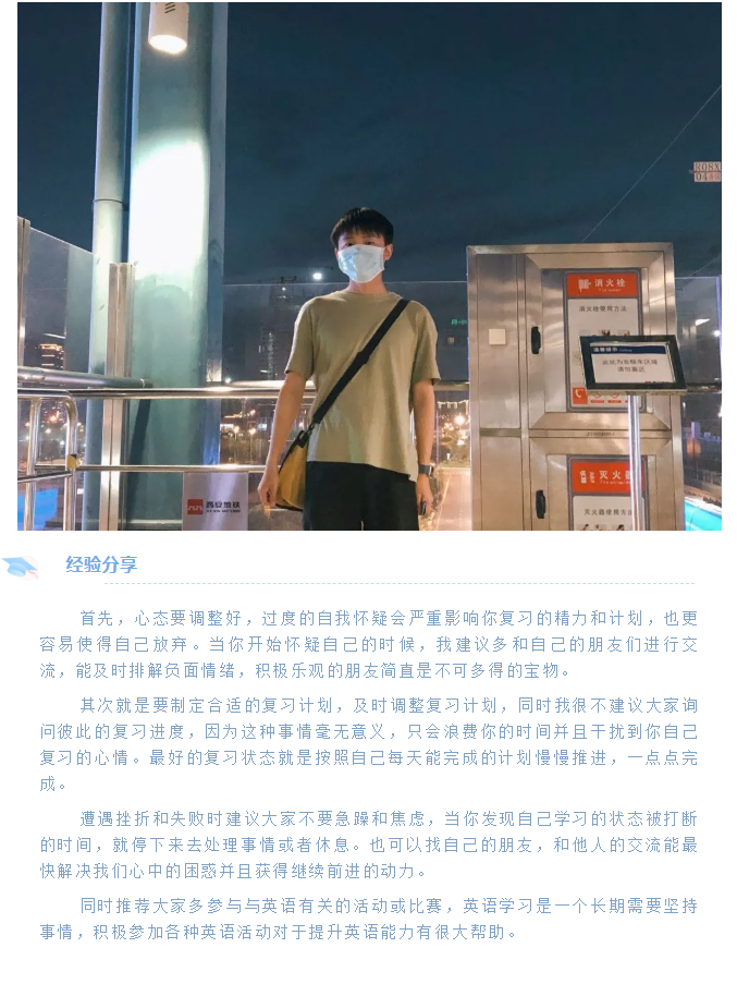 “我和大家一样对未来都很不确定,也认为自己没什么特长甚至不知道自己想干什么,但是无法逃避就应该尝试去思考自己的未来,比如自己的工作学习计划甚至未来的婚姻家庭,凡事预则立,经常考虑自己的未来其实能给你整体的生活提供一个方向,并且这种未来的计划是会变化的,现在的信息也十分丰富,有意去了解你感兴趣的方向,最终确定自己大致的未来规划。”王立波提到,“当我意识到考研能为我未来的工作和生活提供一个很好的保护时,我觉得我必须得坚持下去。”