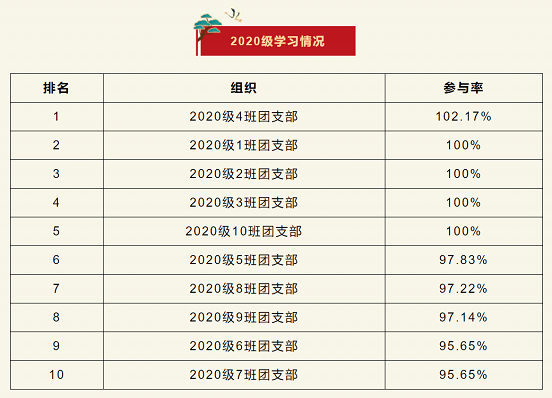 在上一期“青年大学习”网上主题团课的学习中,2020级4、1、2、3、10班团支部位居榜首。