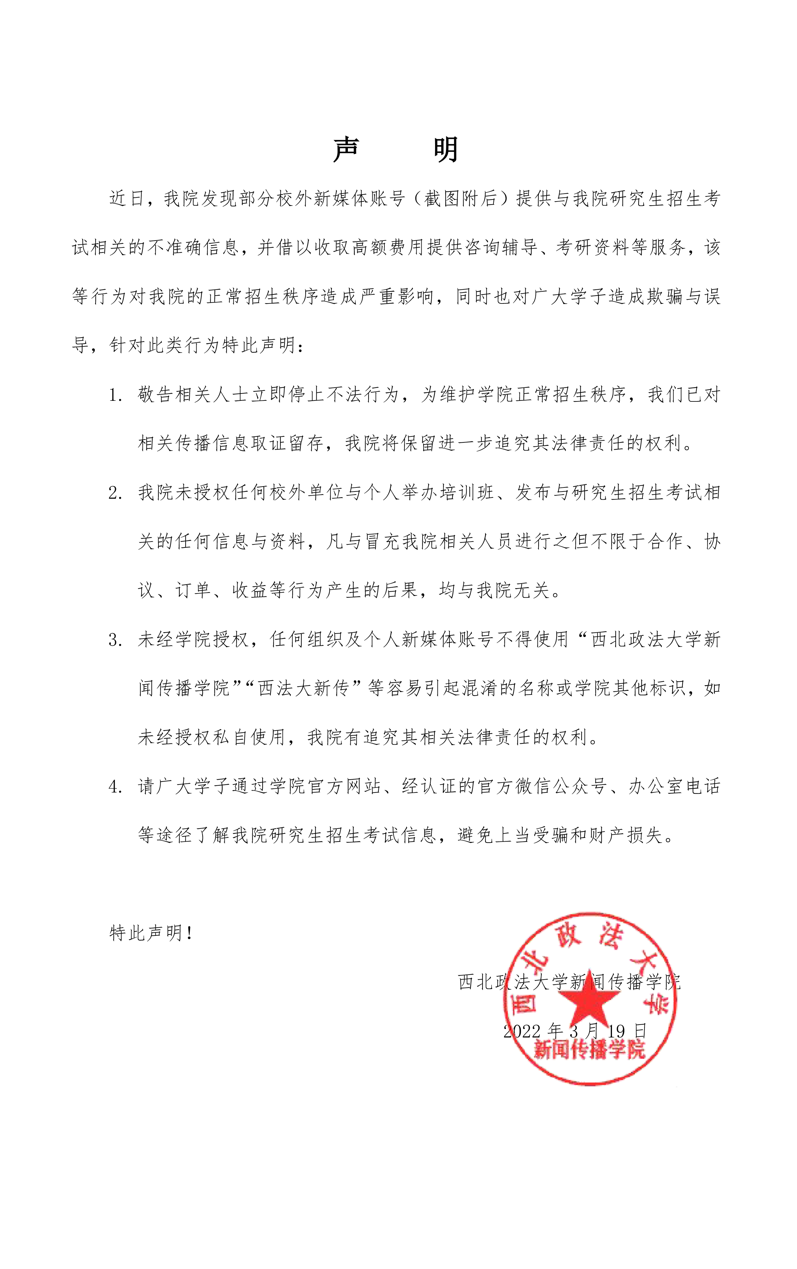 关于不法新媒体发布西法大新传考研不实信息的严正声明