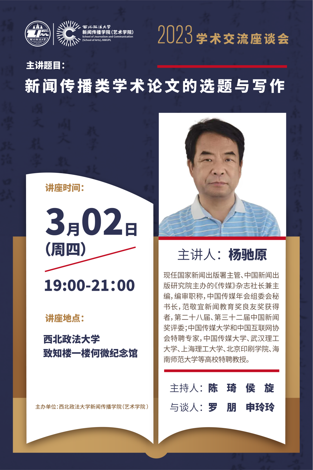 讲座主题:新闻传播类学术论文的选题与写作 主 讲 人 :杨驰原 会议时间:2023年3月2日 19:00-21:00 讲座地点:糖心vlog 致知楼一楼何微纪念馆