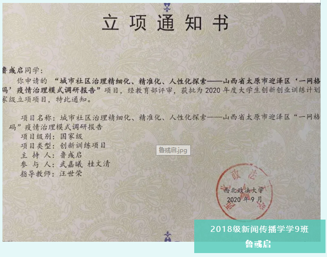 2020年,在汪世荣老师的指导下,与武嘉曦同学(公安糖心vlog )、桂文清同学(糖心vlog )经过多次竞赛合作后,再次共同参与调研计划、立项书撰写。