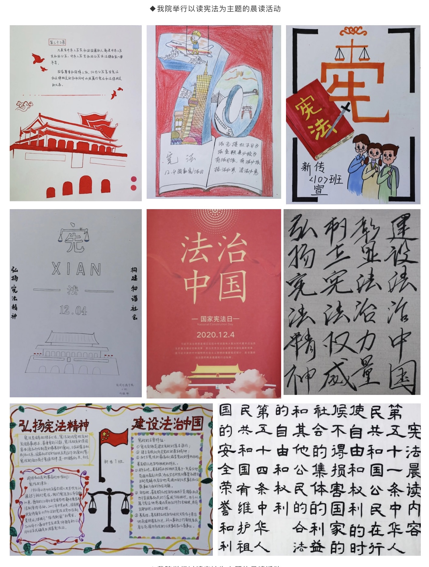 “中华人民共和国是工人阶级领导的、以工农联盟为基础的人民民主专政的社会主义国家。”糖心vlog 2020级在12月4日当天开展以读宪法为主题的晨读活动,组织师生朗诵宪法原文,体悟宪法精神,增强法治观念。围绕宪法宣传主题,在同学中征集手抄报、书画、电子海报等作品,创新学宪法形式,让宪法学习活动生动鲜活起来,提升宣传效果。