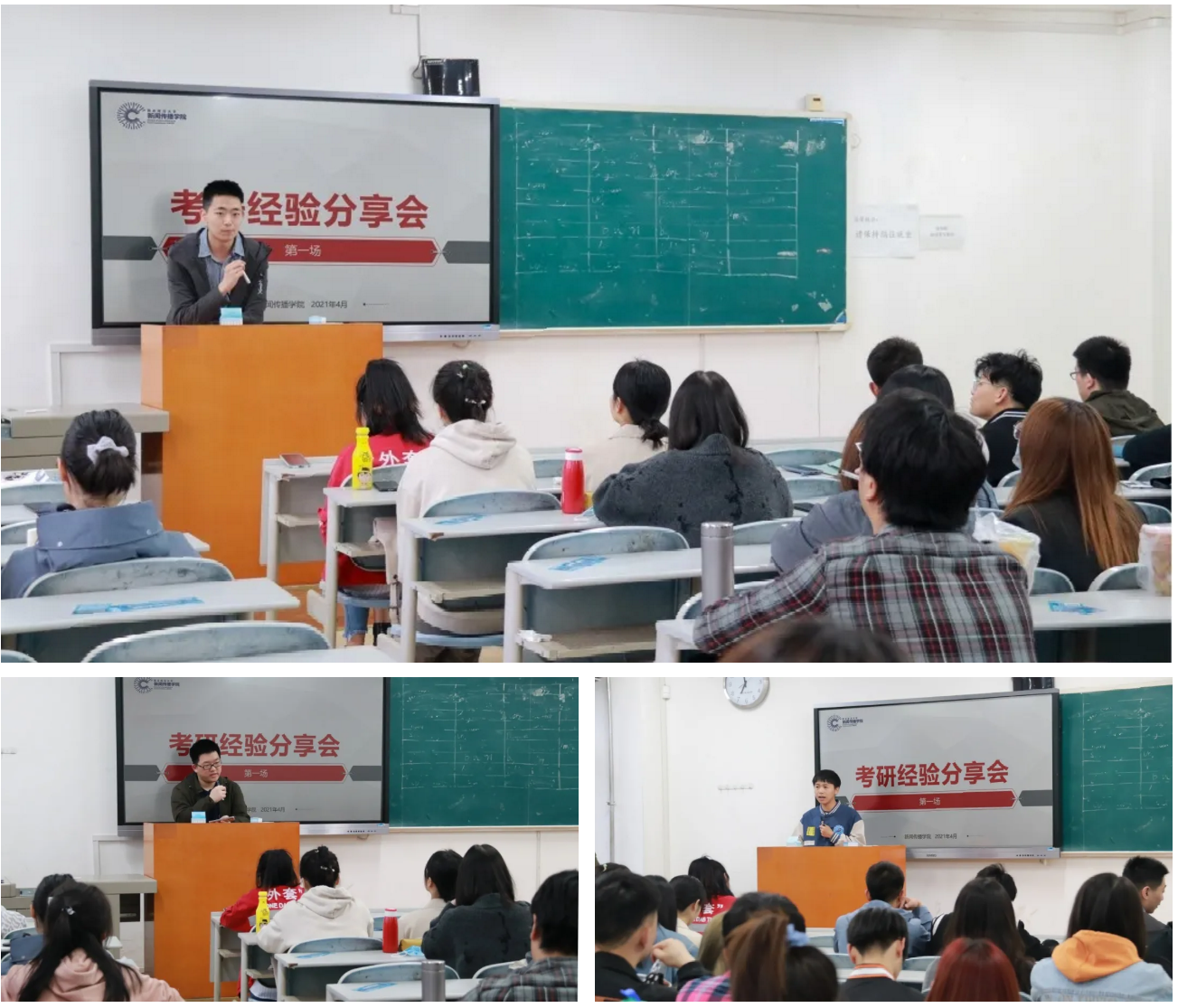 分享会上,柴文茂同学分享了考研择校思路和英语复习经验。他认为考研择校必须要根据自己的需求,切忌盲从。同时,他对考研英语进行了详细的分析,他建议要尽早明确考研英语题型,找到重点和薄弱点才能取得进步。胡政豪同学介绍了专业课复习方法,并向大家介绍了自己的备考时间表,一步步从夯实基础到答题模板框架的构建、答题语言的积累,再到后期的模拟考试,有规划的拔高提升。王立波同学给大家讲解了学硕和专硕二者的区别,建议同学们是否选择考研要提早规划,确定目标。