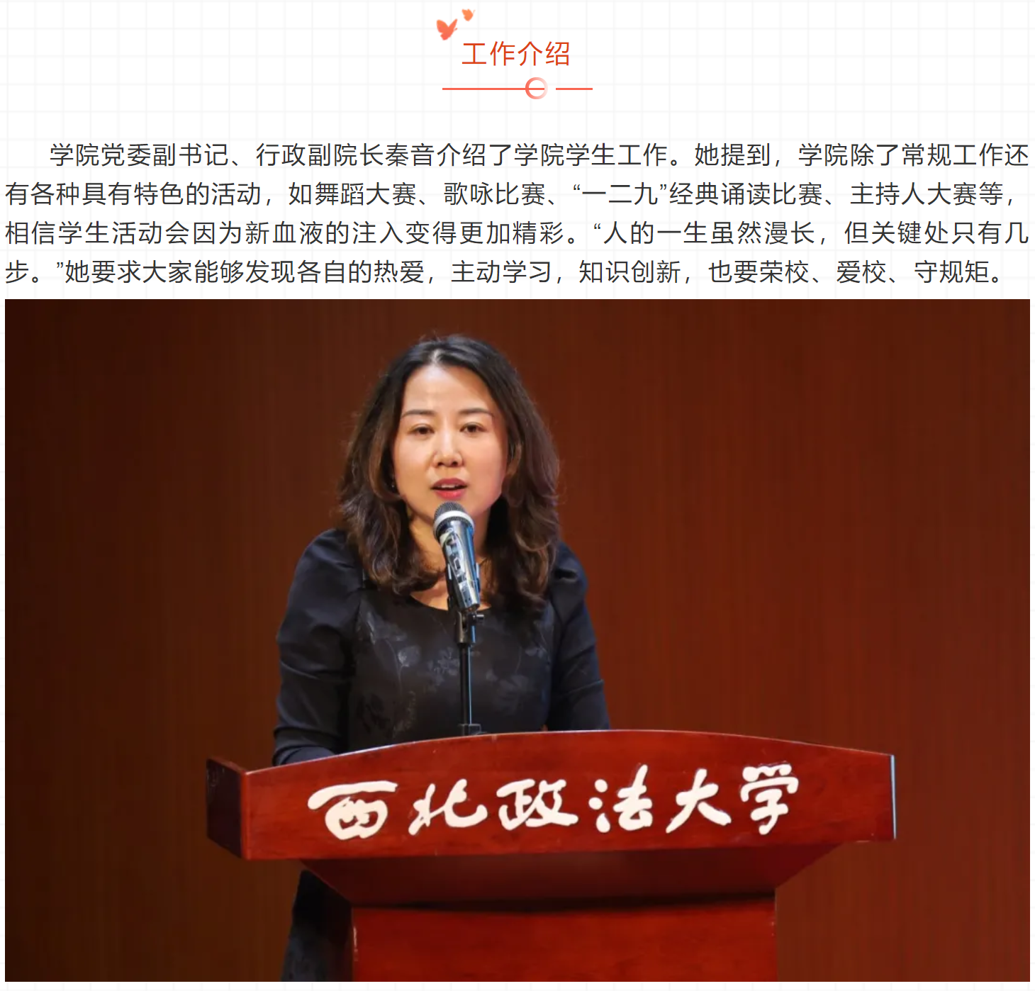见面会最后,刘渊勉励2021级新生,作为党和人民放心的“强国一代”,希望同学们在今后的笃学之路上,秉承老延大“政治坚定、实事求是、勇于创新、艰苦奋斗”的优良传统,大力弘扬“严谨、求实、文明、公正”的西法大校训,以“法治信仰、中国立场、国际视野、平民情怀”为成长目标,坚定方向、拓展格局、追求卓越、砥砺前行,努力成为新时代最优秀的新闻传播人才。