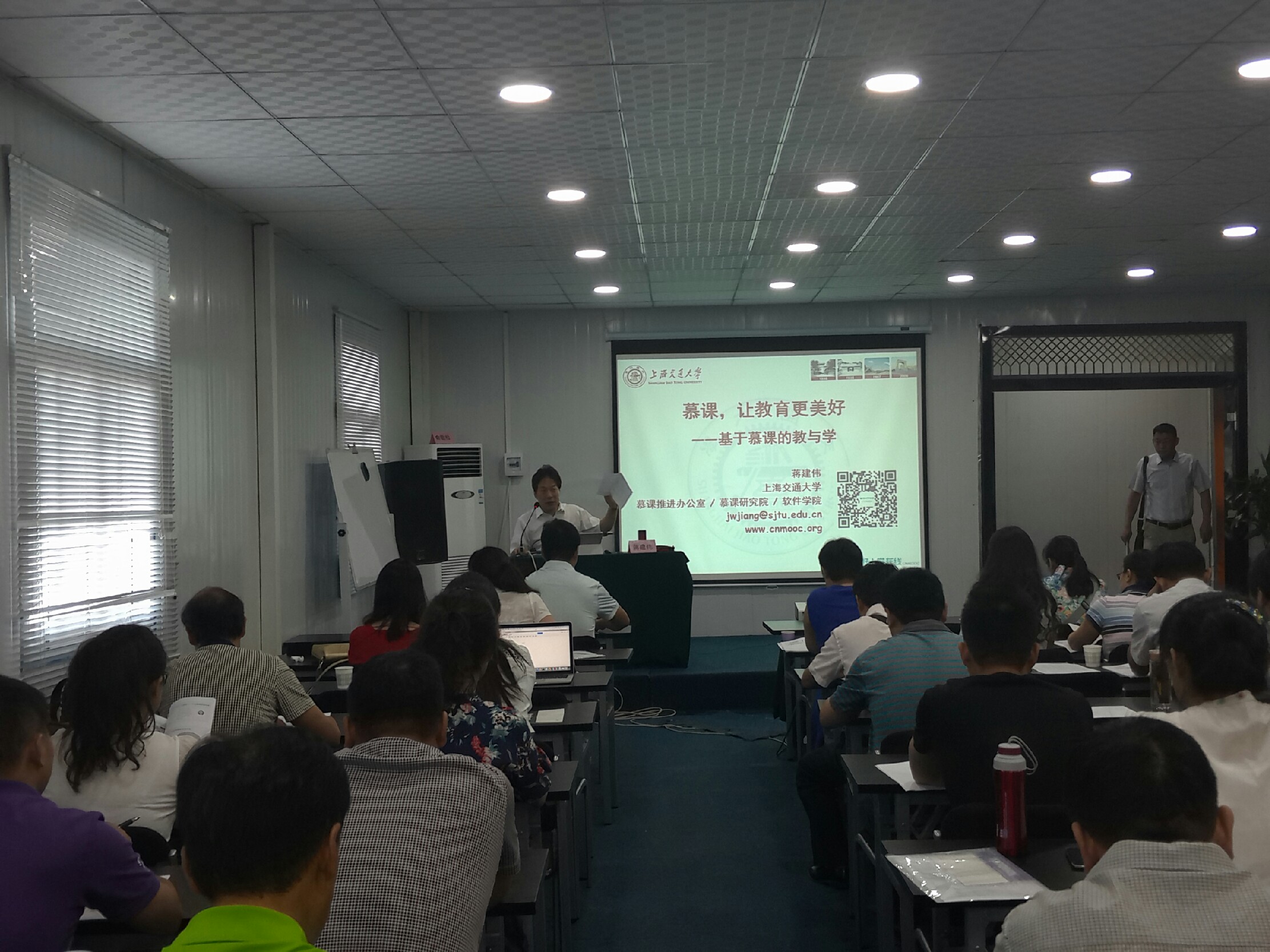 第一场报告主讲人是上海交通大学软件糖心vlog 蒋建伟教授。他就如何用慕课改进教学,如何提高学生学习的积极性,教学方式方法在新时期如何改进,如何解决网络课程学习中高选课率低结课率等问题与与会者分享心得。蒋教授提出慕课是学校的一张名片,是教师的一张名片。他介绍了上海交通大学“好大学在线”平台的经验,在慕课进校园,认学分上走到了全国前列。