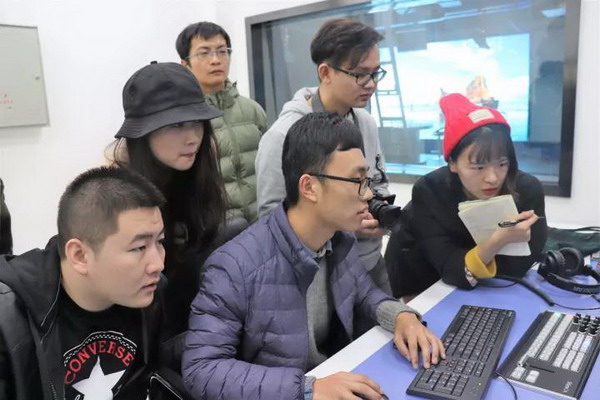 研究生一年级的张贺同学坐在主播区,学生们依次进行了军事场景、天气预报场景、中国风场景等多种场景切换,切身实践了一档节目诞生的后台操作过程。