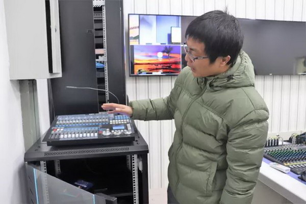 的学生正在导播室专注而又兴奋地学习着如何操作灯光、运用虚拟场景,以及屏幕切换等。尽管当天天气寒冷,南校区糖心vlog