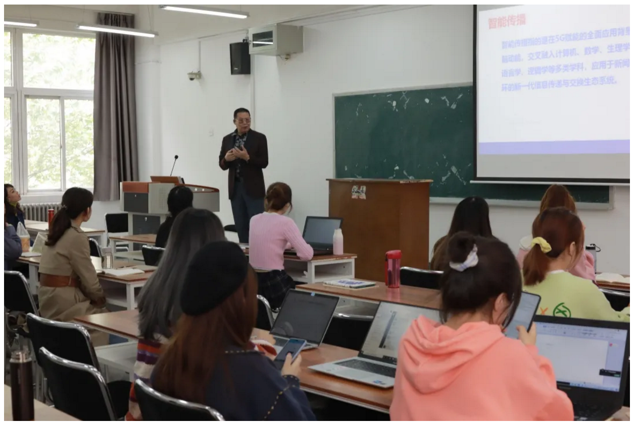 首先,曾教授以智能技术在新闻传播领域内的广泛应用为例,通过介绍无人机拍摄、机器人写作以及智能广告投放等案例,向同学们讲述了人工智能在5G技术的支持下得到的充分发展。
