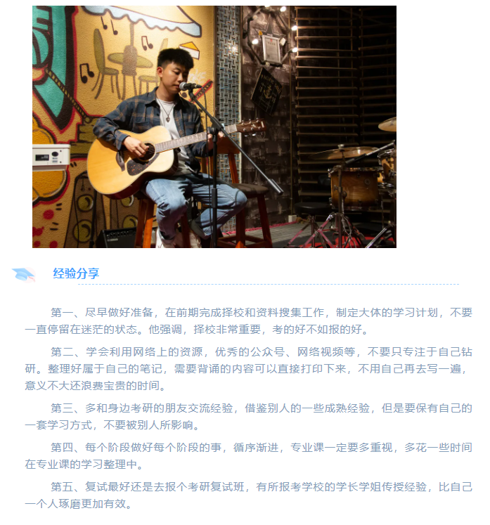 “我觉得就一心一意去准备考研就好了,坚定自己的方向,同时也要给自己留有一些放松的时间。”考研准备过程中其实没有太多难忘的经历,对吴志伟而言备考的这段日子是平凡而又充实的。“我觉得最难忘的应该还是考研复试的准备阶段,那时候报了一个云大的复试班,当时我们20个人,每天都在复习和模拟面试,从最开始的紧张、无话可说,到后面慢慢的能够从容应对。那段时间特别难熬,很考验人的心态,我很庆幸自己坚持下来了,最后我们复试班20个人成功上岸了19人,在看到自己的名字那一刻,喜悦真的是难以言表的。”