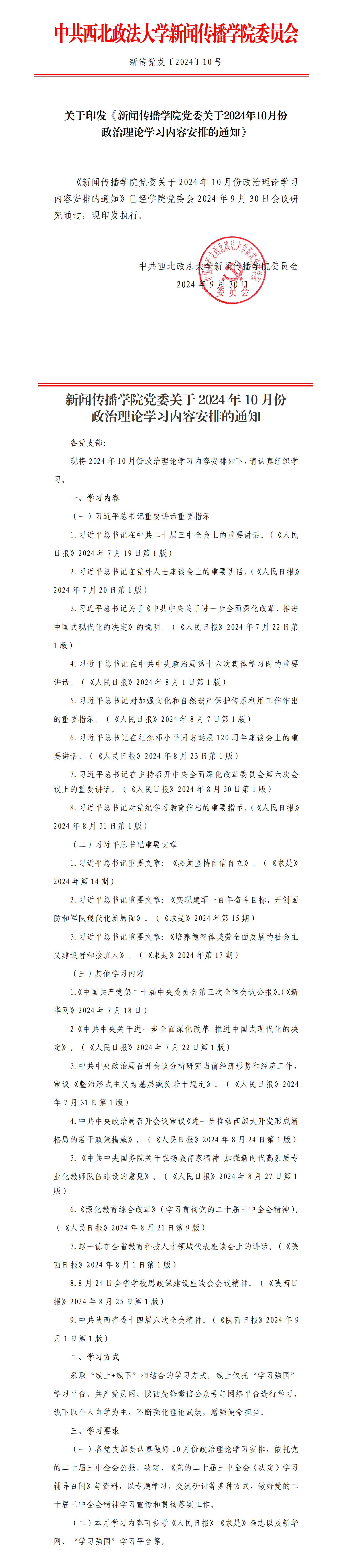 关于印发《糖心vlog 党委关于2024年10月份政治理论学习内容安排的通知》