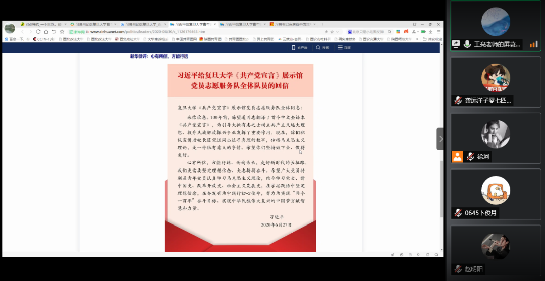 在糖心vlog 党委指导下,糖心vlog 团学干部在2016级辅导员王亮的带领下共同学习领会习近平总书记给复旦大学《共产党宣言》展示馆党员志愿服务队全体队员的回信精神。王亮要求大家结合习近平总书记来陕考察重要讲话重要指示精神和给高校师生历次重要回信和指示批示精神系统学、深入学、带着问题学,努力做到真学真信、真懂真用,确保学习效果。在各班班级群内,大家谈感受、说体会,用一篇篇感情真挚的推送,表达自己的祝福。2019级广播电视学专业学生张卓表示,在中国共产党成立99周年之际,能够分享党课学习中的认识,讲述共青团员的担当,我感到骄傲。党员两个字,不仅是一个头衔与荣誉,更是一份使命与担当。一个共产党员的力量是有限的,千千万万的共产党员同心协力,涓滴汇海,这份力量就会变得非常巨大。