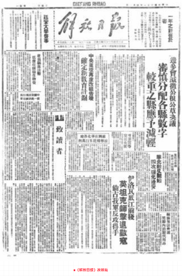 《解放日报》改版后,开始以抗日民主根据地的新闻报道为主,密切联系群众和工作实际,积极配合党的中心工作。版面安排也面目一新:第一版为反映各解放区情况的要闻版,第二版为陕甘宁边区版,第三版为国际新闻版,第四版为副刊和各种专论版。改版后的《解放日报》,党在继续整风中大抓新闻工作的党性问题,各中央局、中央分局都认真贯彻执行,经过整风对报纸的改造,《解放日报》和各地党报面貌大变,具体表现为: