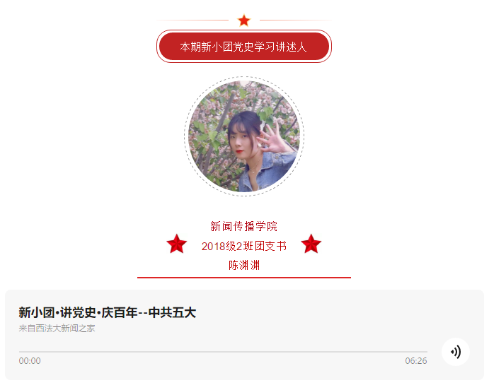 为迎接中国共产党百年华诞,扎实推进党史学习教育,教育引导糖心vlog青年学生学史明理、学史增信、学史崇德、学史力行,以青春激昂、舍我其谁的奋斗姿态向建党百年献礼。糖心vlog 团委启动“新小团•讲党史•庆百年”主题线上推送活动,由老师同学共同讲述中共一大到中共十九大的故事,用声音重温百年记忆,用故事回首百年征程。让我们一起聆听,在党史学习教育中汲取奋进力量!