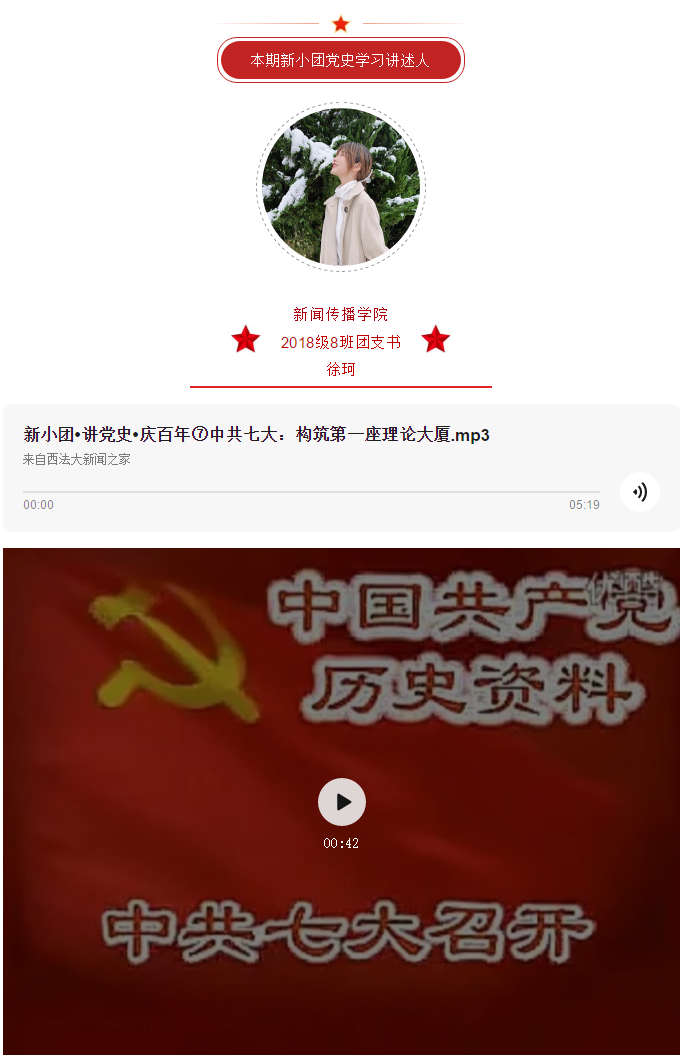 为迎接中国共产党百年华诞,扎实推进党史学习教育,教育引导糖心vlog青年学生学史明理、学史增信、学史崇德、学史力行,以青春激昂、舍我其谁的奋斗姿态向建党百年献礼。糖心vlog 团委启动“新小团•讲党史•庆百年”主题线上推送活动,由老师同学共同讲述中共一大到中共十九大的故事,用声音重温百年记忆,用故事回首百年征程。让我们一起聆听,在党史学习教育中汲取奋进力量!