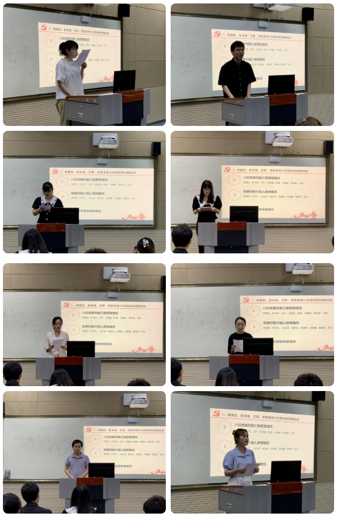 随后,8位发展对象的入党介绍人侯瑞婷同志、林羽凡同志 、孙玉寻同志、陶奕冰同志、苏津津同志、祁家睿同志、南碧欣同志、张令同志从思想、学习以及工作情况依次对这8位发展对象进行了相关介绍,并表明同意推荐各位发展对象转为预备党员的意见。