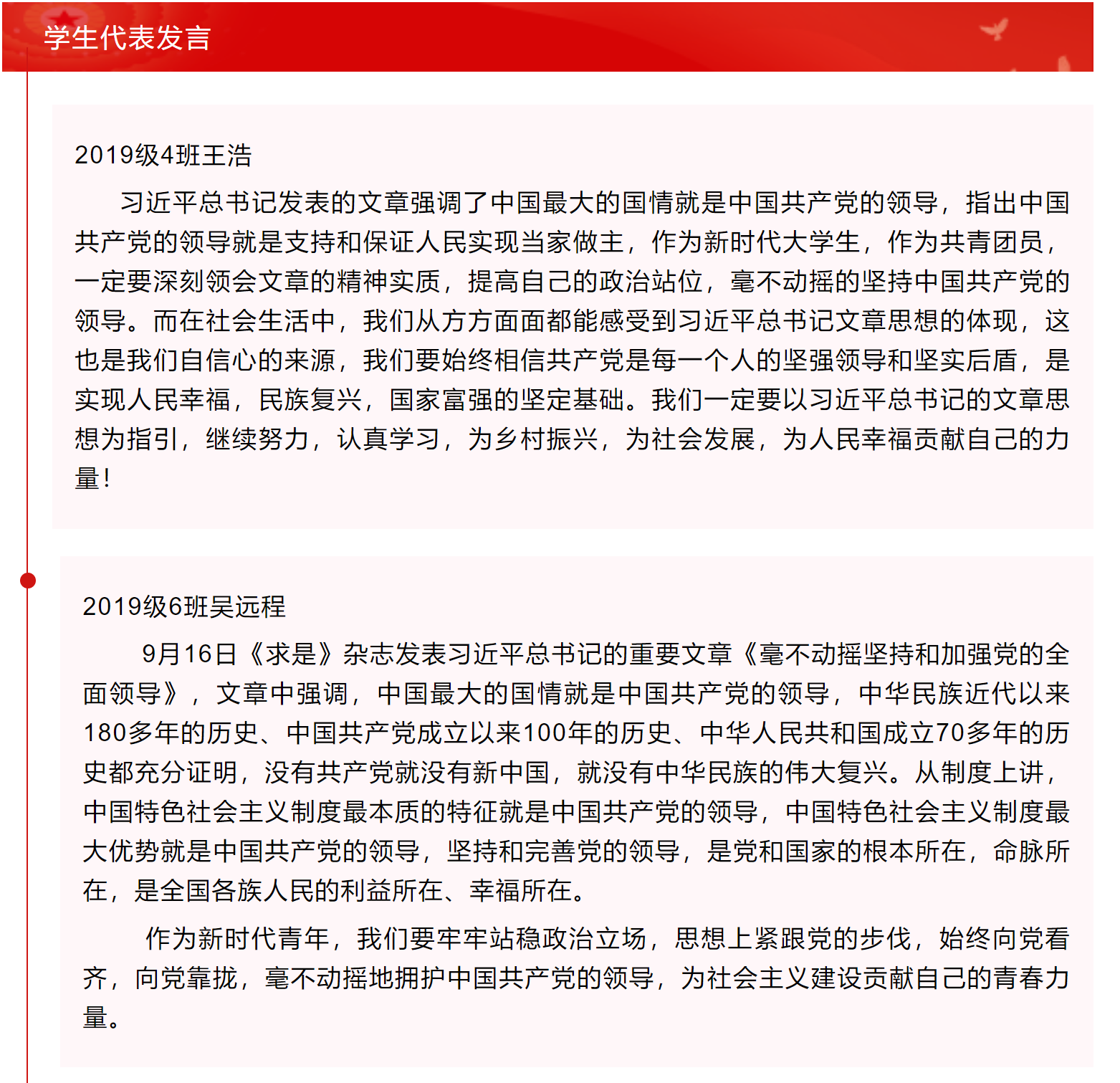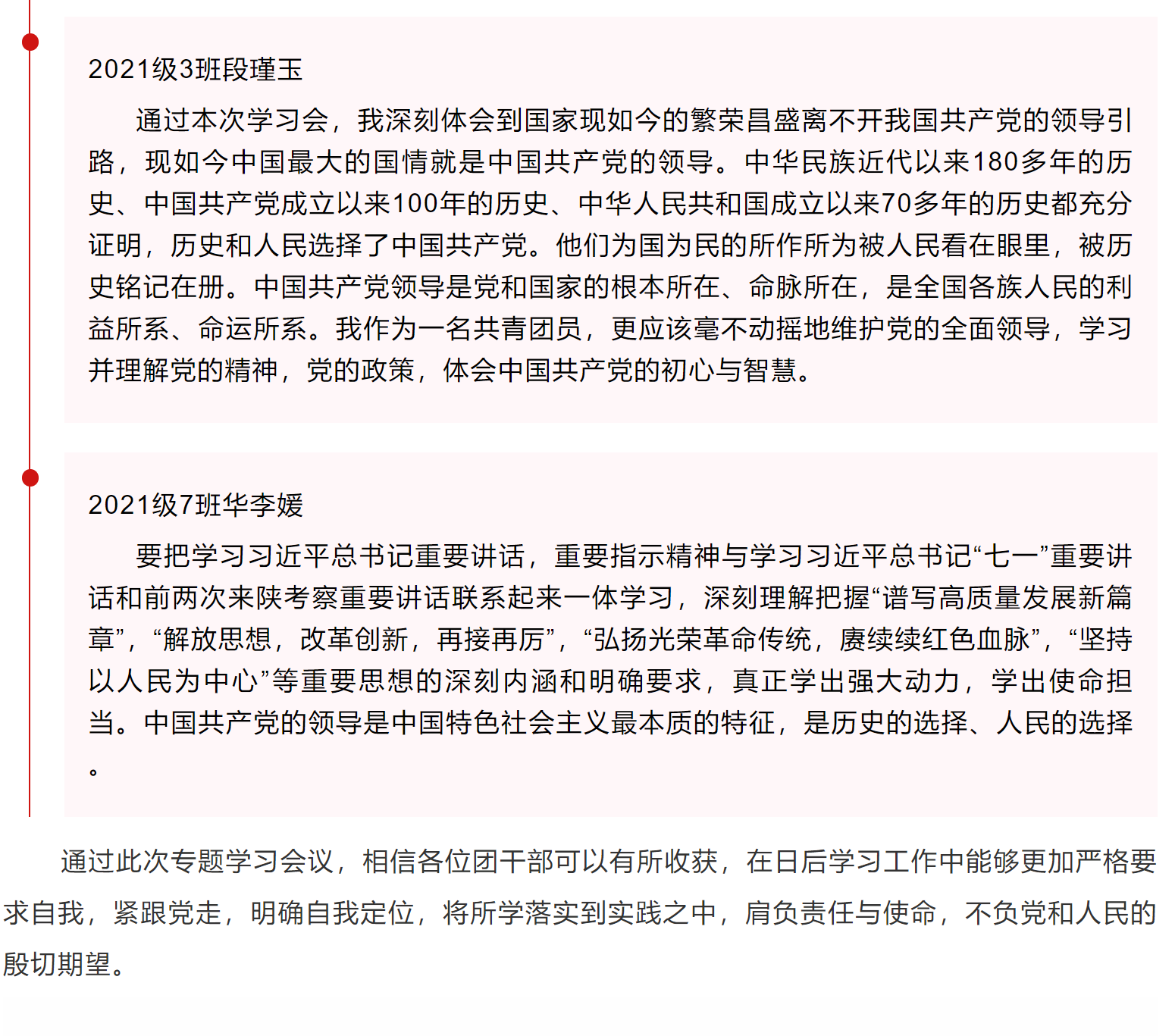 王亮带领大家深入学习习近平总书记“七一”重要讲话精神,回顾中国共产党在百年光辉历程中创造的伟大成就,领悟中国共产党的伟大建党精神,把握实现中华民族伟大复兴的“九个必须”,牢记习近平总书记对广大青年的寄语和嘱托。接着,王亮带领大家学习习近平总书记来陕考察重要讲话重要指示精神,重点阐释了习近平总书记到陕西榆林考察调研时的重要讲话精神中关于坚持和完善党的领导、能源低碳发展、生态文明建设、人民至上、深化教育教学改革等方面的重要指示要求的重要性。随后,王亮对《求是》杂志发表的习近平总书记重要文章《毫不动摇坚持和加强党的全面领导》做了解读。王亮表示,中国共产党始终坚持党性原则,站在人民立场,全心全意为人民服务,新时代团员青年在紧跟党走,提高思想站位的同时要踏实学习,做好自己的事情。