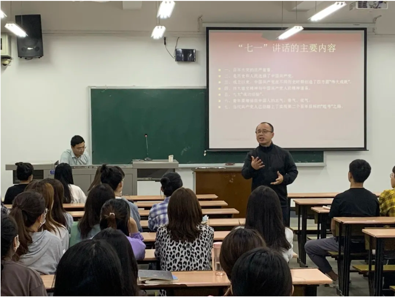 最后他总结了总书记“七一”讲话的特点,话语是平易近人的,思维是理性与感性结合的,并且总结了历史经验告诉我们以后应该怎么走。