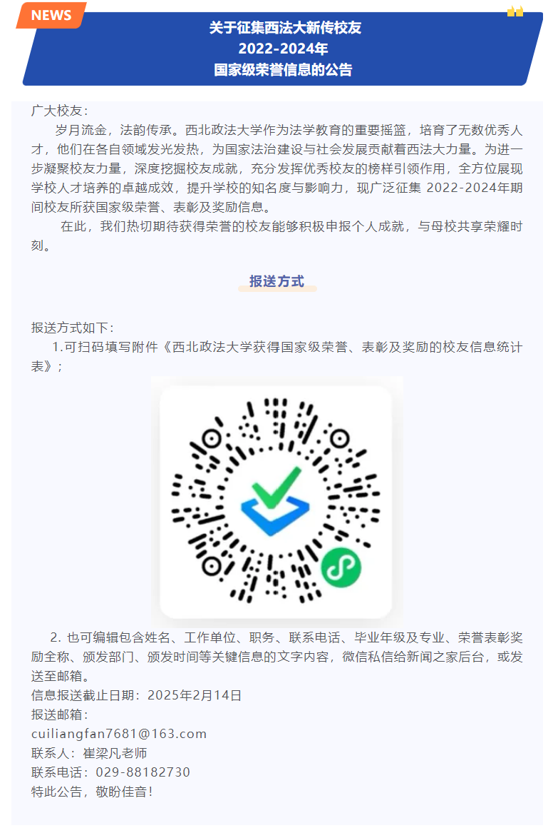 关于征集西法大新传校友2022-2024年国家级荣誉信息的公告