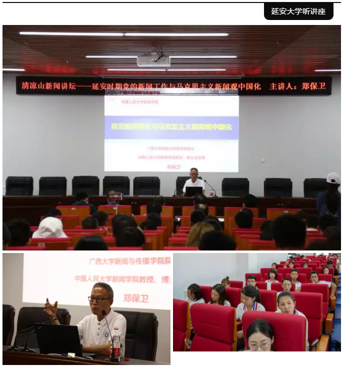 教授郑保卫所做的以“延安时期党的新闻工作与马克思主义新闻观为主题”的讲座。