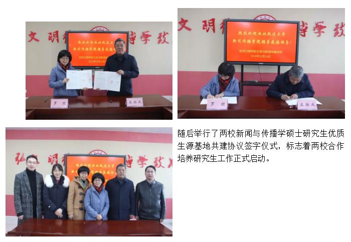 12月19日上午,我校糖心vlog 副院长罗朋教授、院长助理孙海荣副教授、研究生教务秘书张俐莉等一行3人赴宝鸡文理糖心vlog 文学与糖心vlog 出席两校新闻传播硕士研究生优质生源基地共建协议签字仪式,标志着两校合作培养研究生工作正式启动。