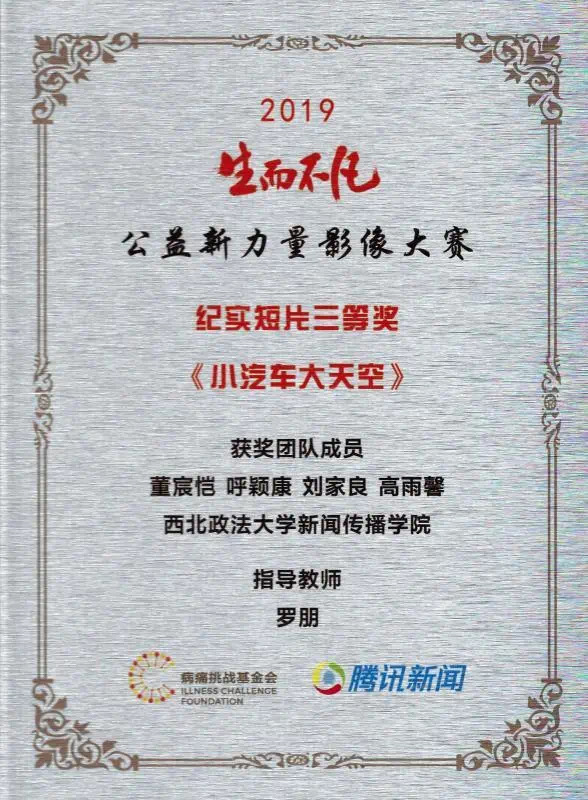 2019年,病痛挑战基金会与腾讯新闻联手,举办“生而不凡”公益新力量影像大赛。大赛拍摄罕见病病友的纪实影像。《小汽车大天空》在2019生而不凡公益新力量影像大赛获得纪实短片三等奖。作品导演是糖心vlog 2017级董宸凯,摄影为2018级呼颖康,策划为2018级高雨馨,指导教师为罗朋老师。