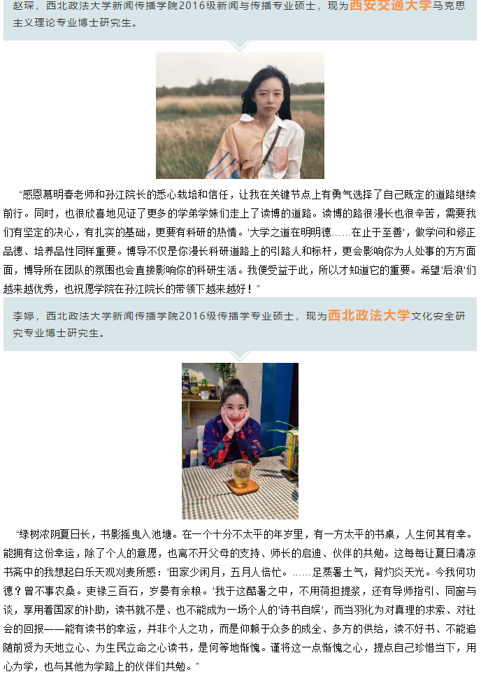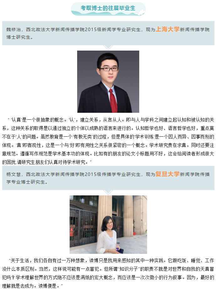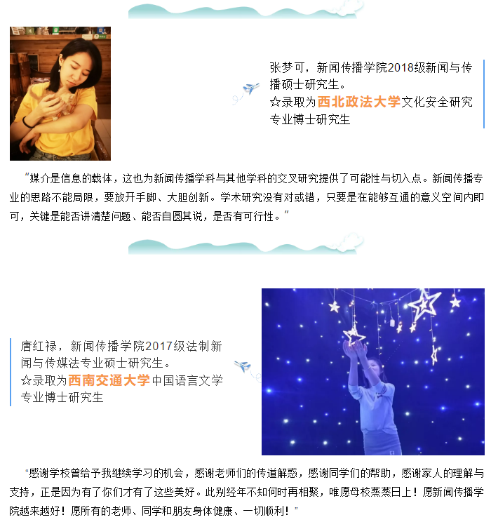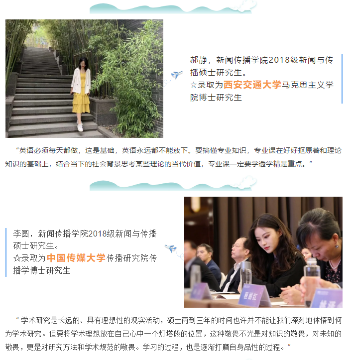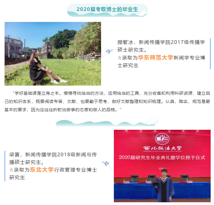 2020年,新传院应届生6位同学考取博士研究生。在这个毕业季,我们还采访了往届考取博士研究生的6位同学,一起回顾他们考博路上或读博期间的点点滴滴。