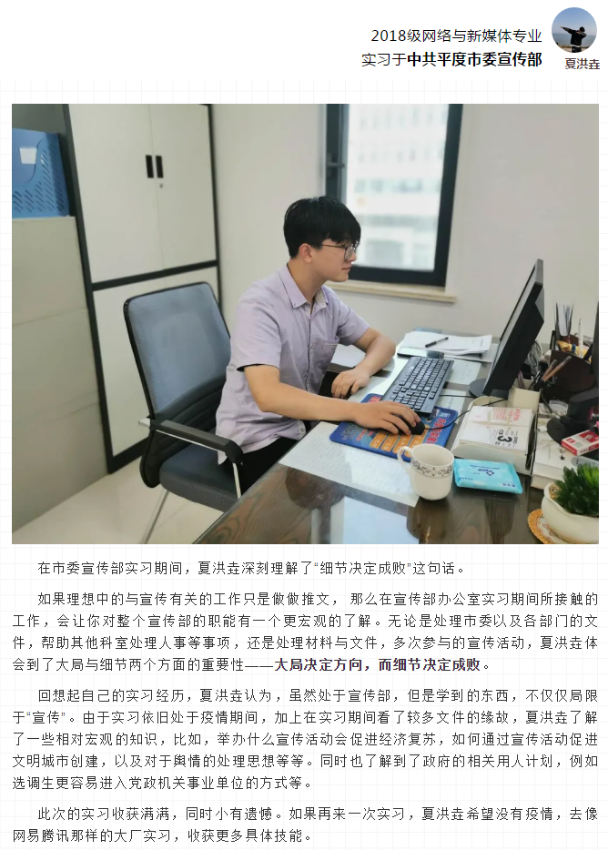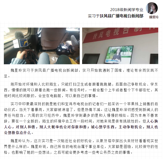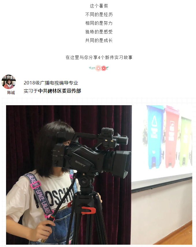 回想这次实习,每一次活动对她来说其实都很深刻,但是最难忘的应该是自己一个人独立完成了一份节目策划,从迷茫无处下手、大量查找资料、不断的修改调整,直至最后写出一份完整的策划案,不仅是因为这项任务对于一个人来说工程量比较大,更是从零到整的这份工作经历也让陈诚记忆犹新。通过这次实习,她掌握了一定的采编播技术能力,但最重要的是更加清楚的知道自己想要的是什么。