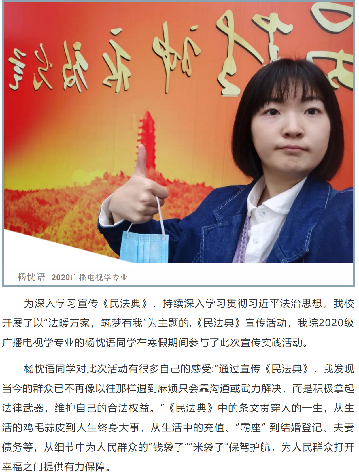 编者按:为深入学习宣传《民法典》,根据学校“法暖万家 筑梦有我”活动要求,即日起西法大新闻之家推出“新传青年说·法暖万家”专栏,记录糖心vlog学生在宣传《民法典》实践活动中的精彩瞬间,一起分享经验心得、践行法治信仰,用实际行动彰显西法大青年的精神风貌。