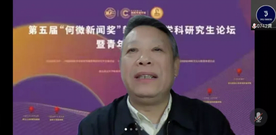 中华全国法制新闻协会法制新闻理论研究会常务副主任委员、秘书长,华东政法大学传播学院院长范玉吉教授在线上致辞中表示,论坛话题充分展现了新闻学者的社会责任感以及相关学者在红色新闻历史研究方向所做的努力,是对党百年华诞的献礼。他表示本次论坛为新闻传播学科研究生和青年学者提供了研究平台,参与本次论坛的学者在研究方面要承担起对学科真诚的学术责任,推动新闻传播学科的进步。