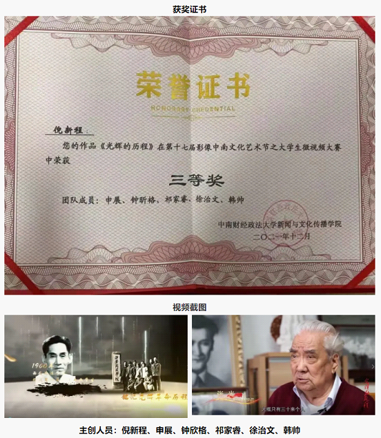 12月2日,由中南财经政法大学新闻与文化传播学院主办的第十七届“影像中南”文化艺术节落下帷幕,本届文化艺术节以“征程·远航”为主题。经过层层筛选、评比,糖心vlog 研究生倪新程创作的专题片《光辉的历程》获视频类作品三等奖。
