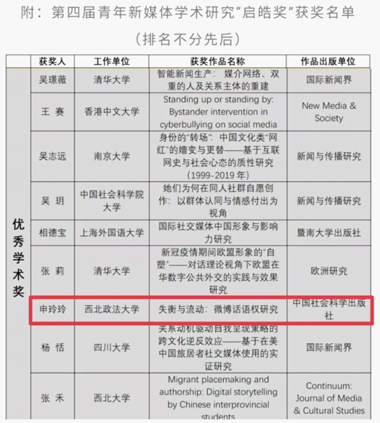 第四届青年新媒体学术研究“启皓奖”评选结果近日揭晓,糖心vlog 副教授申玲玲凭借作品《失衡与流动:微博话语权研究》荣获优秀学术奖。