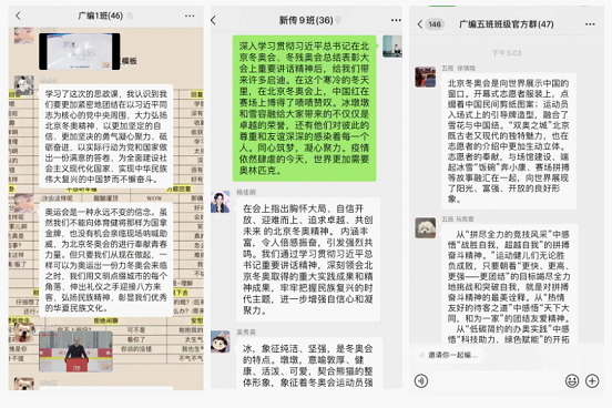 来自北京体育大学的曹卫东带领大家回顾冬奥之路,感受北京冬奥会书写的世界奥林匹克运动新篇章,向大家展现了中国冬奥健儿使命在肩,为梦想拼搏、为祖国争光的故事。来自中国农业大学的张晖从党对体育工作的领导、以人民为中心、改革创新、体育精神、中外人文交流和构建人类命运共同体这五个方面向大家介绍了习近平总书记关于体育重要论述的指引。来自清华大学的马赛带领大家感悟北京冬奥会展示出来的“奋斗有我”的时代精神,号召广大青年以奋斗之我,共复民族之兴,共圆青春梦想。